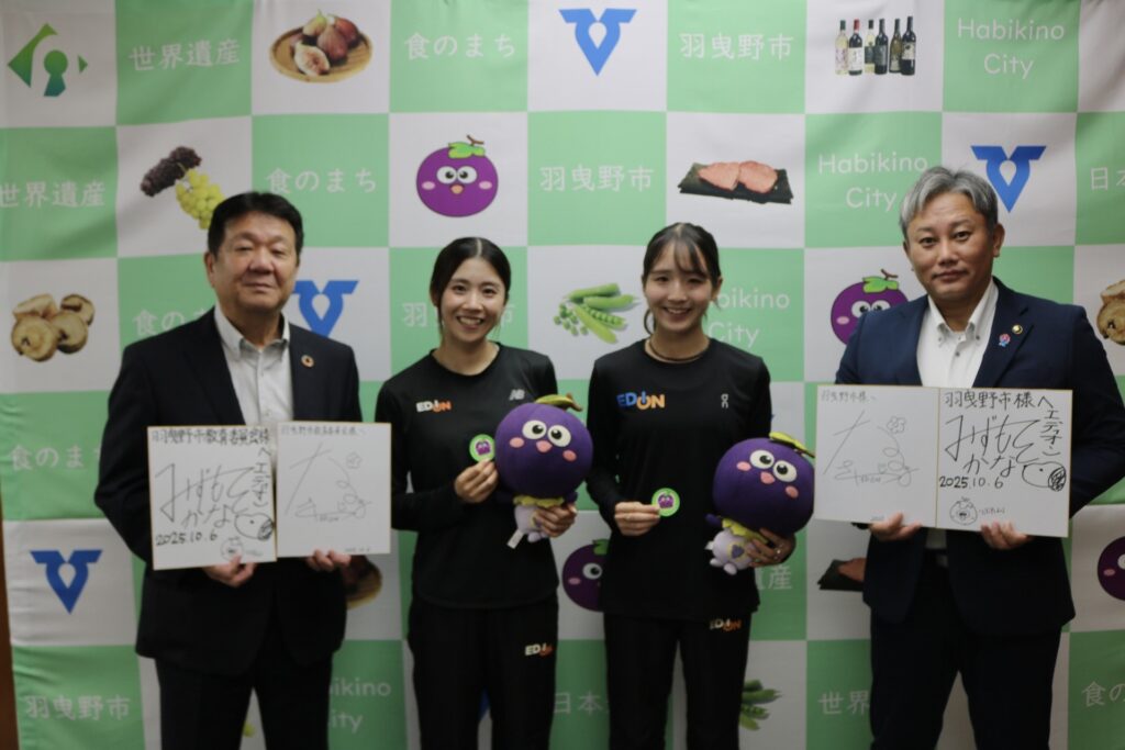 2025年10月6日(月)羽曳野市出身の中島 紗弥選手と水本 佳菜選手が羽曳野市役所を訪問し、山入端 創市長、村田 明彦教育長と対談を行いました。