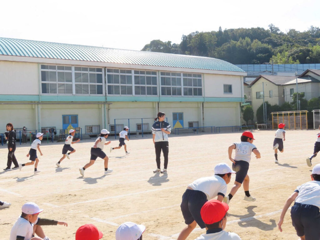11月4日(火)、広島県教育委員会主催の「体育に関する指導者派遣事業」において、上女子100mハードル元日本代表、エディオンの木村文子が、海田町立海田東小学校に講師としてお招きいただき「走り方教室」を実施しました。