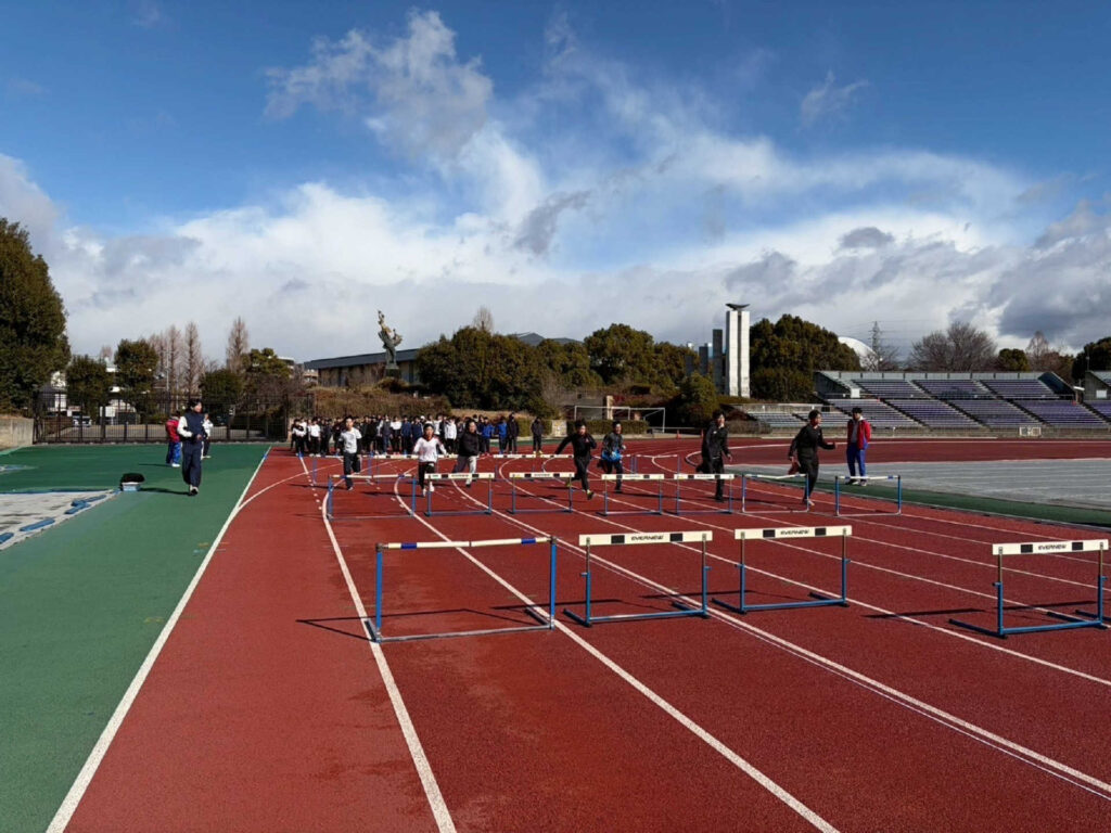 午前の陸上教室では、「陸上競技を楽しむこと」をテーマに、普段から陸上競技に取り組んでいる参加者たちと一緒に身体を動かしました。準備運動では、多様な身体運動を紹介し、普段の練習では取り入れることのない動きを体感してもらいました。ハードル未経験の選手もいましたが、ミニハードルやフレキハードルを活用することで、新しい種目に触れる時間も設けました。当日は、厳しい寒さとなりましたが、最後にチーム対抗のシャトルリレーを行い、全員で元気にプログラムを締めくくりました。