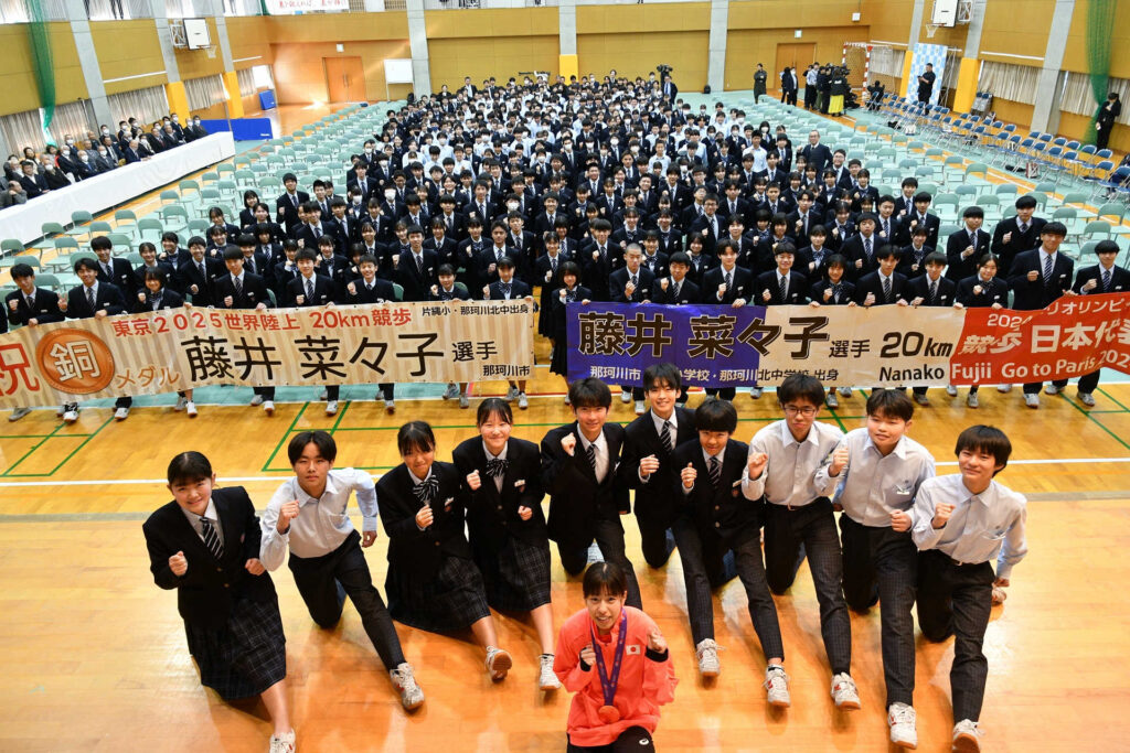 記念セレモニーでは、恩師や同級生、親友からのお祝い動画が披露されたほか、母校の後輩たちとのトークセッションも行われました。藤井選手から「陸上部の部室は変わってない?」と当時の思い出を懐かしむ質問が飛び出すなど、終始和やかな雰囲気で楽しい時間を過ごしました。