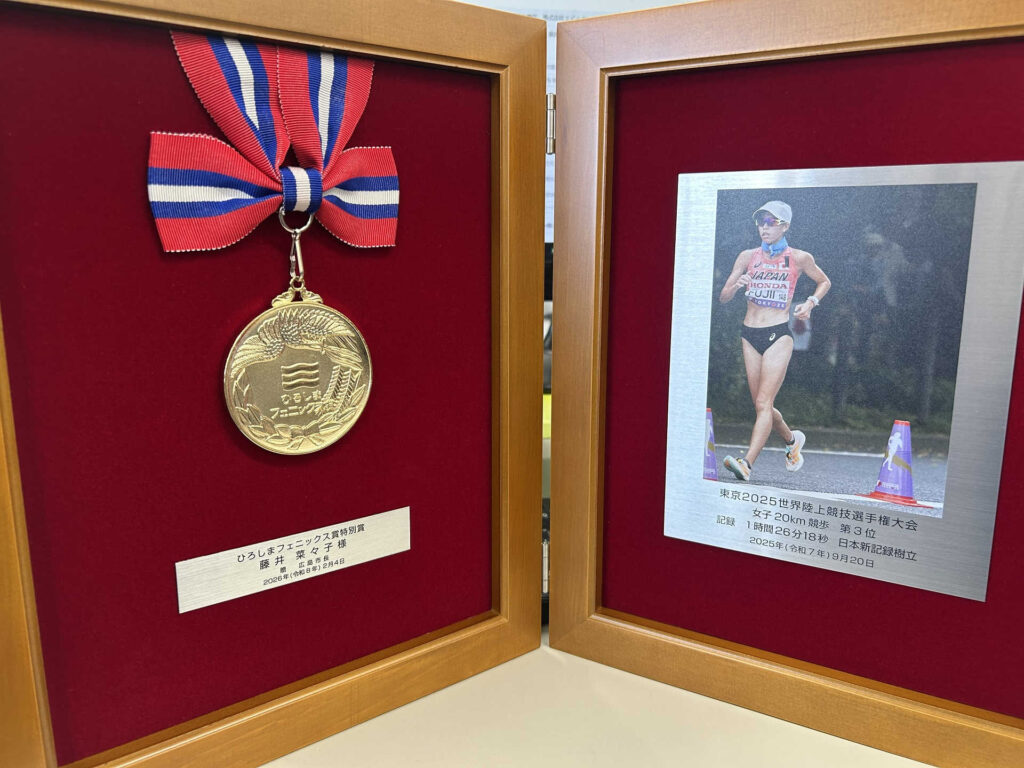 2026年2月4日(水)、藤井菜々子選手が、東京2025世界陸上競技選手権大会女子20㎞競歩における銅メダル獲得、並びに日本新記録樹立を評価いただき、広島市より「ひろしまフェニックス賞特別賞」を受賞いたしました。